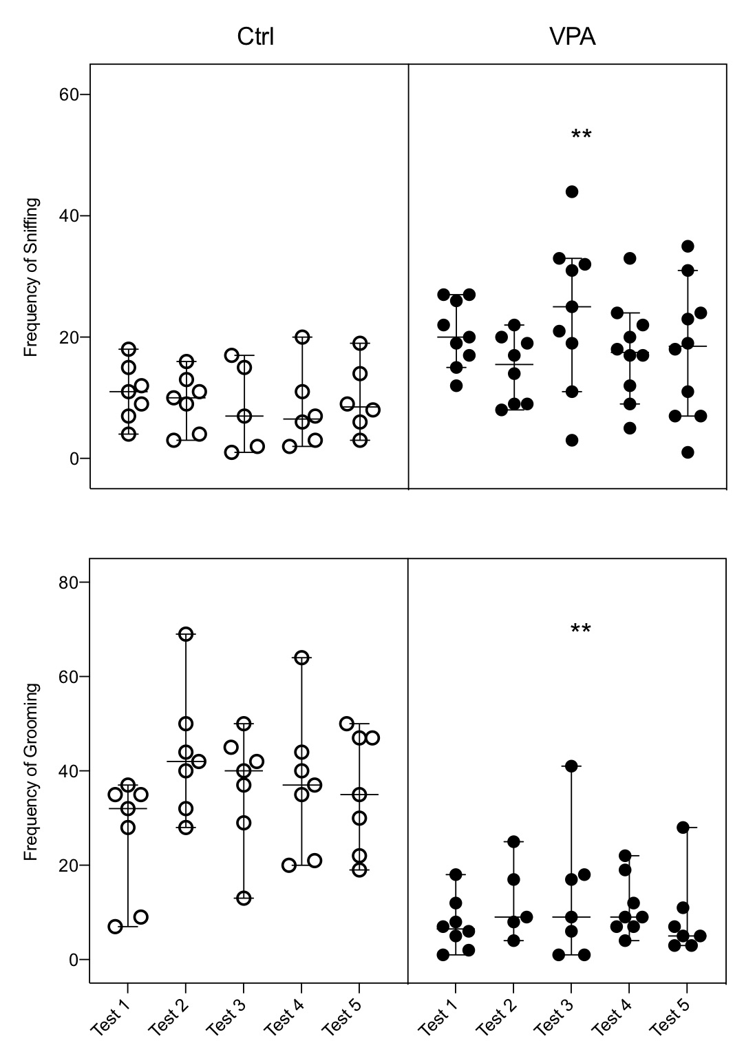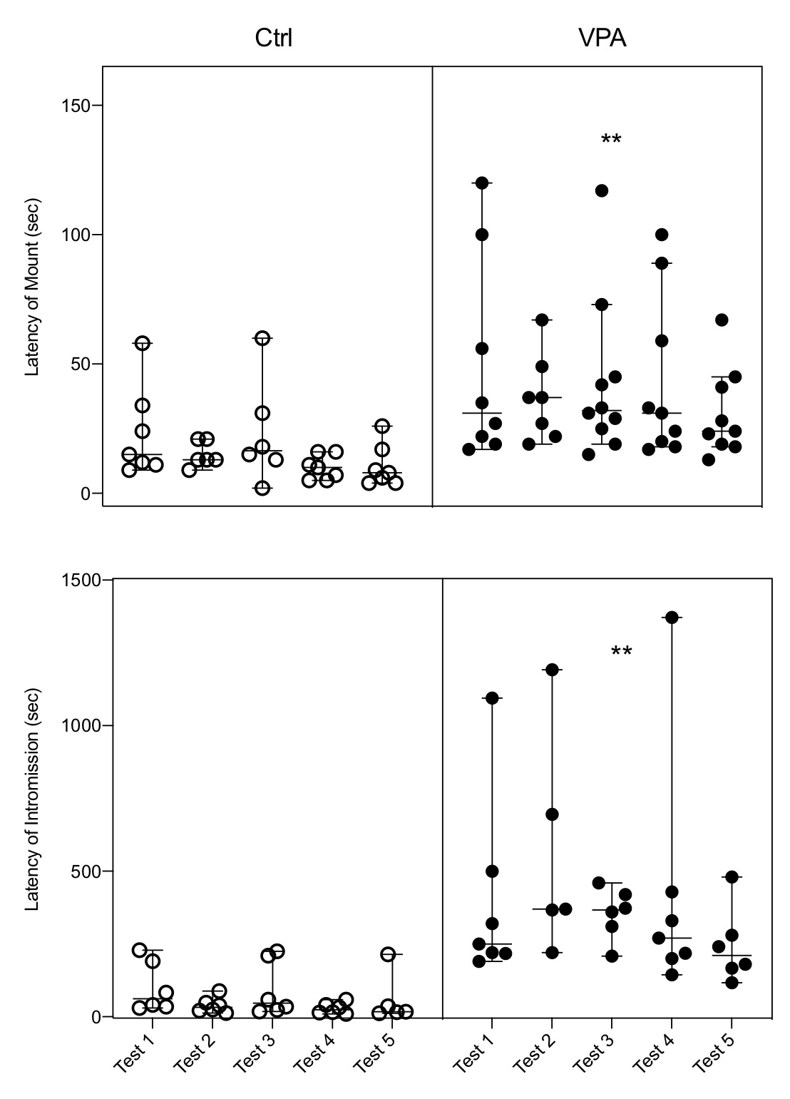 Autism is a spectrum of neurodevelopmental disorders with growing concern due to the high prevalence that is observed in children all over the world, with boys being more affected than girls in a 4:1 ratio. Autism has a wide spectrum of behavioral alterations; however, in most cases, it is not a life-threatening disorder. Thus, autistic children grow up to reach puberty and become sexually mature. Then, they face a new challenge, i.e., dealing with its own reproductive biology. Sexual education is a complex issue for adolescents with autism1 although most of them display reproductive responses such as menarche2 or normal plasma androgens,3 and in turn show sexual drive and accompanying behaviors, but they are displayed out of the social norms.4 The sexual behavior and physiology of reproduction in adolescents and adults with autism is still poorly understood, which affects the development of effective therapies and educational strategies. Thus, in this work we used a recognized rat model of autism to get further knowledge. The laboratory rat has two remarkable features, it is an appropriate model of autism, and its sexual behavior and reproductive physiology have been thoroughly characterized.5-7 Two widely used rat models of autism is obtained by exposing embryos or pups to valproic acid (VPA). Rat embryos exposed to VPA on days 11.5 to 12.5 of gestation have a number of neuronal alterations that make them display autistic behaviors as newborns,8 being a useful procedure for the study of autism.9-12 The other VPA rat model of autism is obtained with a daily exposition to VPA from postnatal day 6 to day 12.13 While VPA induced autistic rats have been used to study behavioral, anatomical, and physiological aspects of autism there is no characterization of their sexual behavior and reproductive physiology. In this work, we studied sexual behavior in the postnatal VPA model of autistic male rats, as a first approach to characterize the physiological effects of autism in adolescence and adulthood. The sexual behavior and reproduction of male rats have been thoroughly documented, and abundant literature dealing with its neural, endocrine, cellular, and molecular basis is available.5714-16 Behavioral patterns during copulation are identified as mount, intromission, and ejaculation, and are recorded as latencies for the first execution of each pattern and the frequency in which they are displayed in a single sexual bout. A male displays several mounts and intromissions until reaching ejaculation. After a refractory period, the male can display another group of patterns and a second ejaculation, and so on until reaching a state of exhaustion following several consecutive ejaculations. Quantification of these patterns have been useful to determine different aspects of reproduction in male rats after specific experimental procedures. We have reported that the transection of the visceral branch of the pelvic nerve alters sexual behavior due to changes in the processes of penile erection and ejaculation.17 In contrast, transection of the somatomotor branch did not affect sexual behavior but produced a decrease of the ejaculated seminal plug that reduces the fertility ratio of males, suggesting a reduction in the forceful tension required to expel the semen from the prostatic urethra to the female vagina.7 Thus, quantification of altered sexual behavior in male rats provides information on the underlying physiological changes. Therefore, here we used this behavior in order to propose some physiological status in the autistic male rat. In addition to understanding how the nervous system affects sexual behavior in autistic individuals, it is important to understand its effects on the whole reproductive system. In this study we focused on the prostate gland as a first approach. The prostate is the largest sexual gland in the male rat reproductive tract that produces essential substances for the potency of sperm to fertilize eggs within the female reproductive tract. It is located at the proximal region of the urethra, the prostatic urethra, as a well-defined globular gland showing two distinctive regions, the dorsolateral and the ventral prostate, and the execution of sexual behavior leading to ejaculation has important effects on the endocrine responses of this gland.6 We have shown that minor endocrine alterations, as the modification in serum prolactin levels, which do not affect the execution of male sexual behavior, produced significant changes at the prostate epithelium that could account for triggering the development of hyperplasia or cancer;18 and prolactin is a key hormone in children with autism under pharmacological treatment. Risperidone is one of the most used medication in autistic children,19 and it is known that this treatment produces hyperprolactinemia.20 In this study we used VPA induced autistic rats to characterize their sexual patterns and to determine the histology of the prostate epithelium.