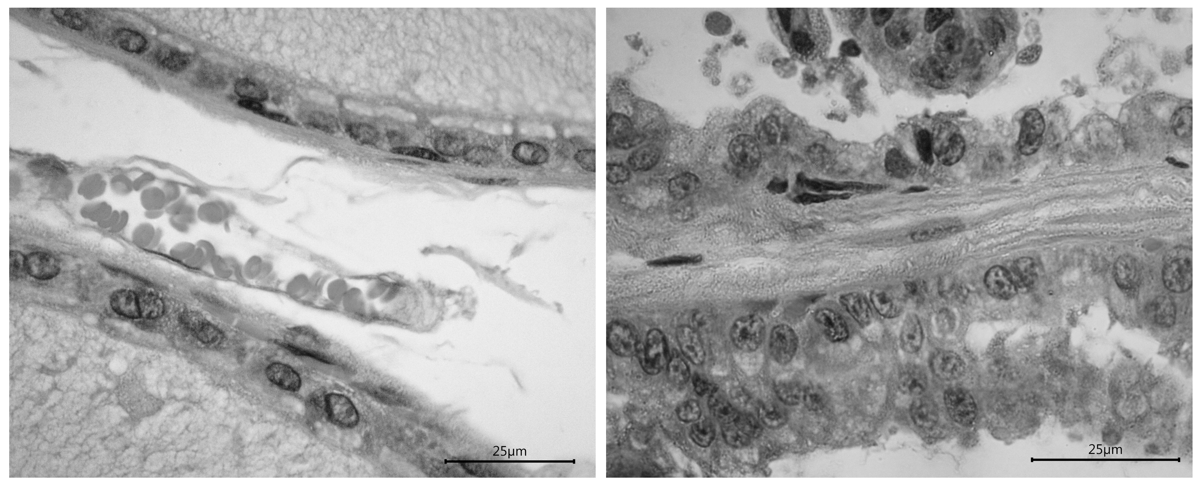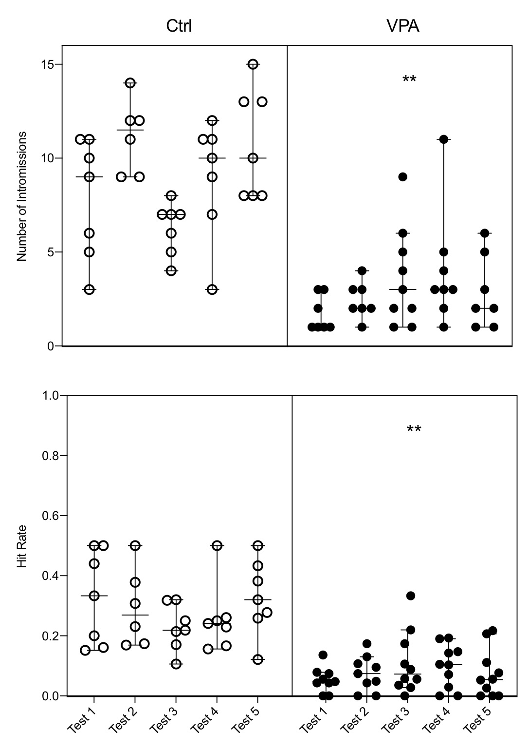 Two groups of sexually active Wistar rats (250-350 g/bw), two females and one male each, were allowed to live together for 10 days to ensure pregnancy.7 They were housed in plastic cages (60 x 40 x 22 cm) containing wood chip bedding and kept in a room maintained at 22 ± 2°C and under a 12:12 LD light schedule (lights on at 2200 h). Commercial pelleted rodent chow (Harlan, Mexico) and water were available ad libitum. After the initial 10 days, females were placed in individual cages for the rest of their pregnancy period. After birth, pup males were randomly assigned to the control group (Ctrl, n=7), or the VPA treated group (VPA, n=10). The day of birth was determined as postnatal day 0 (P0). Pups were continuously observed for proper development, and from P6 to P12 day received a daily i.p. injection of 1 ml of saline solution 0.9% (Ctrl group) or VPA dissolved in saline solution at a dose of 150 mg/kg. After injection, pups were returned to their mothers, weaned on P21, then housed with males of their own group. Each procedure was guided by the Society for Neuroscience Policy on the Use of Animals in Neuroscience Research and the Mexican Policy for the Use and Care of Lab Animals (NOM-062-ZOO-1999). Control and VPA males were allowed to reach puberty (200-250 g/bw) to start the execution of sexual behavior with intact-developed ovariectomized receptive females. Receptivity was induced after females were injected subcutaneously with 10 µg of estradiol benzoate and 2 mg of progesterone, 48 and 4 h before tests, respectively. Once males reached adulthood, mating tests were conducted during the last third of the dark period. After 5 min adaptation of the male in a Plexiglas cylindrical arena (50 cm high x 50 cm diameter), a receptive female was introduced. The introduction of the female indicated the beginning of the test, the end of the test was after a 30 min period or after recording the male ejaculatory pattern. One copulatory series per animal was recorded twice a week until complete five mating tests. If ejaculation occurred, the couple was allowed to stay in the arena for both, to detect the extent of the refractory period and to determine the proportion of males that started a second copulatory series. Following the last mating test, 5 males chose at random in each group were anesthetized with an intraperitoneal injection of sodium pentobarbital (60 mg/kg bw). An abdominal midline longitudinal incision was made to reach the prostate, and tissue from the ventral (VP) and dorsolateral (DLP) regions of the gland were removed and processed for histology using the hematoxylin-eosin method. The stain with hematoxilin-eosin started by immersing the prostate for 24 h in Helly fixative (Mercuric Chloride 5%, Potassium Dichromate 2.5%, Sodium Sulfate 1%, and Formalin 37%). Then the fixative was washed with tap water for 30 min. Dehydration was carried out by immersing the prostate in ethanol 70% (1 hr), 80% (1 hr), 96% (3 times, 2 hrs each), absolute ethanol (overnight), and absolute ethanol (2 times, 1 hr each). Clearing was done by immersing the prostate in xylene (3 times, 1 hr each). Both dehydration and clearing were carried out under continuous shaking. Then, the prostate was embedded in melted paraffin (2 times, 2 hr each at 57°C) and a block was done by using a microtome cassette. The paraffin block was sectioned on a Leica microtome (5 μm). Sections were placed on a mounting bath with gelatinized water at 52°C and tissues mounted on slides that were placed for 1 hr in an oven (~58°C). For staining, tissues were immersed in xylene (3 times, 5 min each), absolute ethanol/xylene 1:1 (5 min), ethanol 96% (3 min), iodine alcohol (5 min), sodium thiosulfate (10 min), tap water (2 min), Mayer's Hematoxilin (10 min), tap water (30 sec), acid ethanol (fast bath), tap water (10 sec), lithium carbonate (30 sec), tap water (10 sec), Eosin Y (4 fast baths), ethanol 96% (3 min), absolute ethanol (2 min), absolute ethanol/xylene 1:1 (2 min), and xylene (5 min). Finally, sections were coverslipped with undiluted Permount. Each slide had sections from just one region of the prostate, i.e., we obtained ventral slides and dorsolateral slides. The slides were observed in an Olympus Provis AX-70 microscope, and images obtained and analyzed with the Image-Pro Plus software. Measures obtained were the height of epithelial cells and the area of the alveoli. The recording of copulatory movements guided the quantification of behavior. The number of mounts (NM) and number of intromissions (NI) represent their frequencies before ejaculation. The time elapsed from the introduction of the female with the male to the first mount or intromission was recorded as the latency of mount (LM) or latency of intromission (LI), respectively. If the first copulatory movement executed by the male was an intromission, then LM = LI. The time elapsed from the first intromission to the ejaculation was recorded as the latency of ejaculation. A proportion of intromission (hits) was obtained by computing NI/(NM+NI), the result is known as the Hit Rate parameter of copulatory behavior and reflects the capacity of the male to intromit and, therefore, to have erection of the penis.21 According to the experimental design, the graphs and statistical analysis were done with Prism 8 (GraphPad Software, Inc.) by using the Nested t test procedure with significant comparisons when p<0.05.