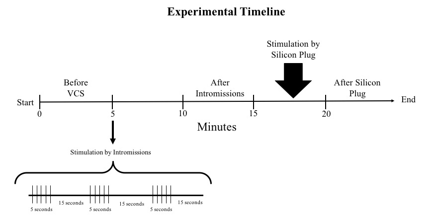 To generate VCS, we provided a pattern of artificial manipulation that attempted to mimic the intromissions and vaginal distention by the sperm plug provided by a male rat to the female during copulation. VCS included intromissions and the placement of a plug that distended the vagina. Intromissions were provided by a 4.5mm x 9.5cm glass rod lubricated with mineral oil introduced 22 mm into the vaginal orifice of the female. Stimulation by intromissions consisted of five 1-second insertions of the glass rod, alternating with 15 seconds of rest, for a total duration of 1 minute (see Figure 1). Ten minutes later a silicon plug (4.5 mm diameter, 12 cm height) was introduced into the vagina of the rats with a tooth stick and remained there by five minutes. The frequency of UC was determined in female rats instrumented during different phases of the EC. As illustrated in Figure 1, frequency of UC was measured during different epochs: 1) before intromissions (baseline), 2) after intromissions, 3) while the silicon plug was placed in the vagina, and 4) after the plug was removed.