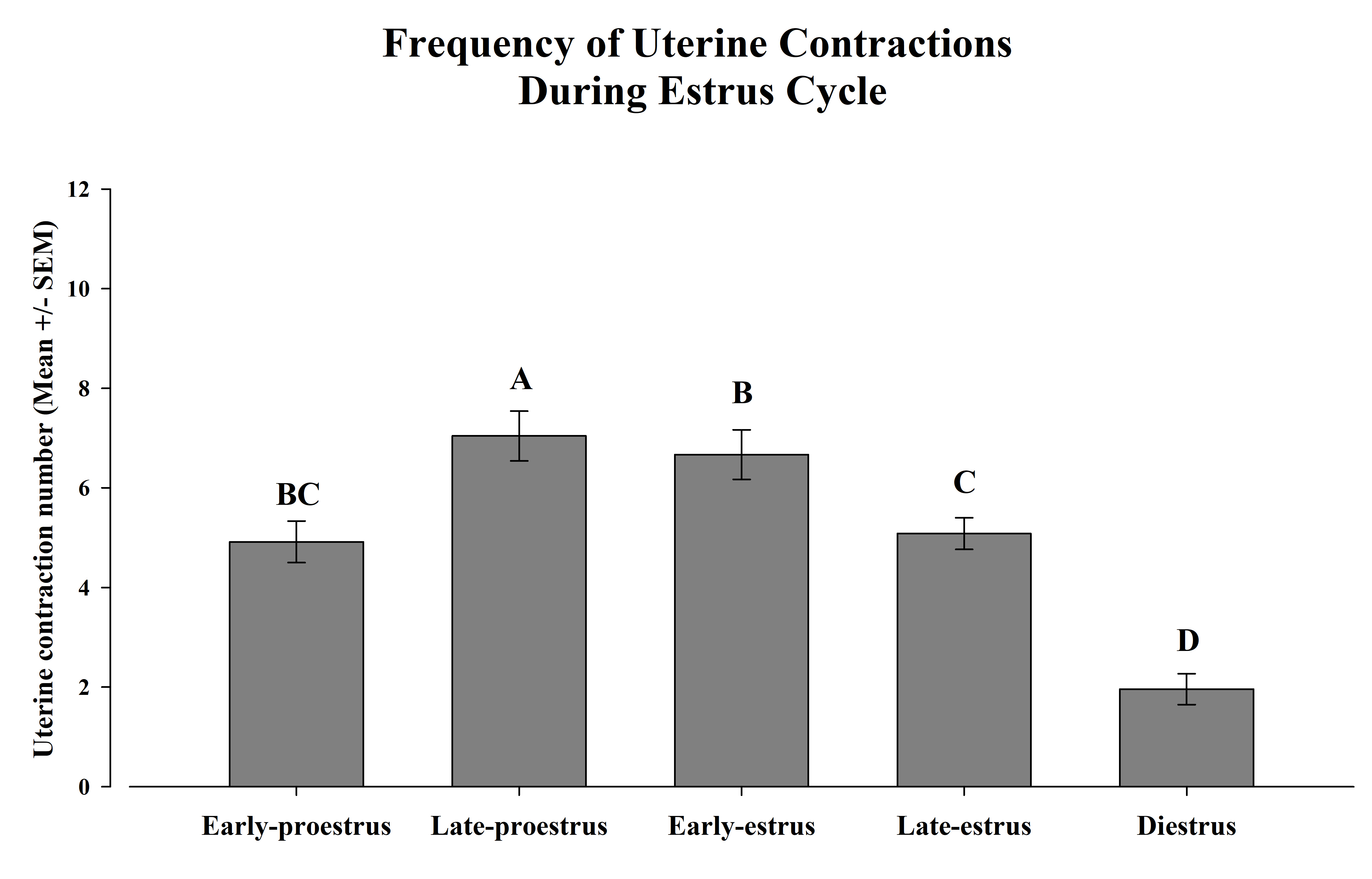Hormones and Estrous Cycle EC is defined as the time from the onset of one period of sexual receptivity to the next and includes changes in the activity of ovaries29 and brain areas related to sexual motivation.30 EC is mainly orchestrated by the action of ovarian hormones regulated by gonadotropins from the anterior pituitary.29,31,32 During proestrus, FSH secretion stimulates maturation of the follicles and both estrogen and LH levels increase as follicles mature. Estrogen released by ovarian follicles also increases the production of LH in the pituitary gland that during estrus stimulates ovulation and the ovarian follicles ruptures. Whereas estradiol decreases at late-proestrus, progesterone, FSH and LH remain elevated until late-estrus. Contrary to the rest of the stages of the EC, diestrus is characterized by a significant reduction in the levels of sexual hormones and by the lack of sexual motivation in females.29,32,33 On the other hand, evidence indicates an interesting interaction between non-ovarian hormones and the EC on the uterine activity of different animals. For instance, in a study, drug-induced uterine activity was recorded via uterine-implanted catheter-tip pressure transducers in bitches during proestrus and estrus, as well as during early and late diestrus. UC was registered in unanesthetized bitches during the EC. Results indicated that uterine activity was greatest during estrus, moderate during proestrus, and low during early and late diestrus. While intravenous injections of prostaglandin F2 alpha (5 micrograms/kg of body weight) induced intrauterine pressures of 107 mm of Hg during proestrus and 115 during estrus. Intravenous injections of oxytocin (0.05 USP units/kg,) induced pressures of 106 during proestrus and 116 mm of Hg during estrus. In contrast, the intrauterine pressure values induced by same hormones during early and late diestrus were 61 and 58 mm of Hg, respectively, and for oxytocin, were 61 and 51 mm of Hg, respectively. Authors concluded that in the bitch, drug-induced uterine activity are decreased during early and late diestrus.34 In addition, it has been observed that oxytocin levels change in serum during the estrous cycle, for example in the female sheep plasma concentrations of oxytocin increase during the luteal phase (proestrus) but decreased during estrus.35 Accordingly, our results indicated that the frequency of baseline UC increased during late-proestrus, decreasing progressively until diestrus. We believe the fluctuations in the levels of ovarian and non-ovarian hormones from proestrus to estrus facilitate the uterine activity and modify the threshold of reflex contractions when the female rat receives sexual stimulation. Since VCS failed in inducing UC during diestrus, it indicates that the increment in the amount of uterine activity as consequence of artificial VCS depends on the action and levels of hormones in the female rat. Nevertheless, future studies must be aimed at exploring the role of every single hormone on the effect of VCS on the uterine activity of females.