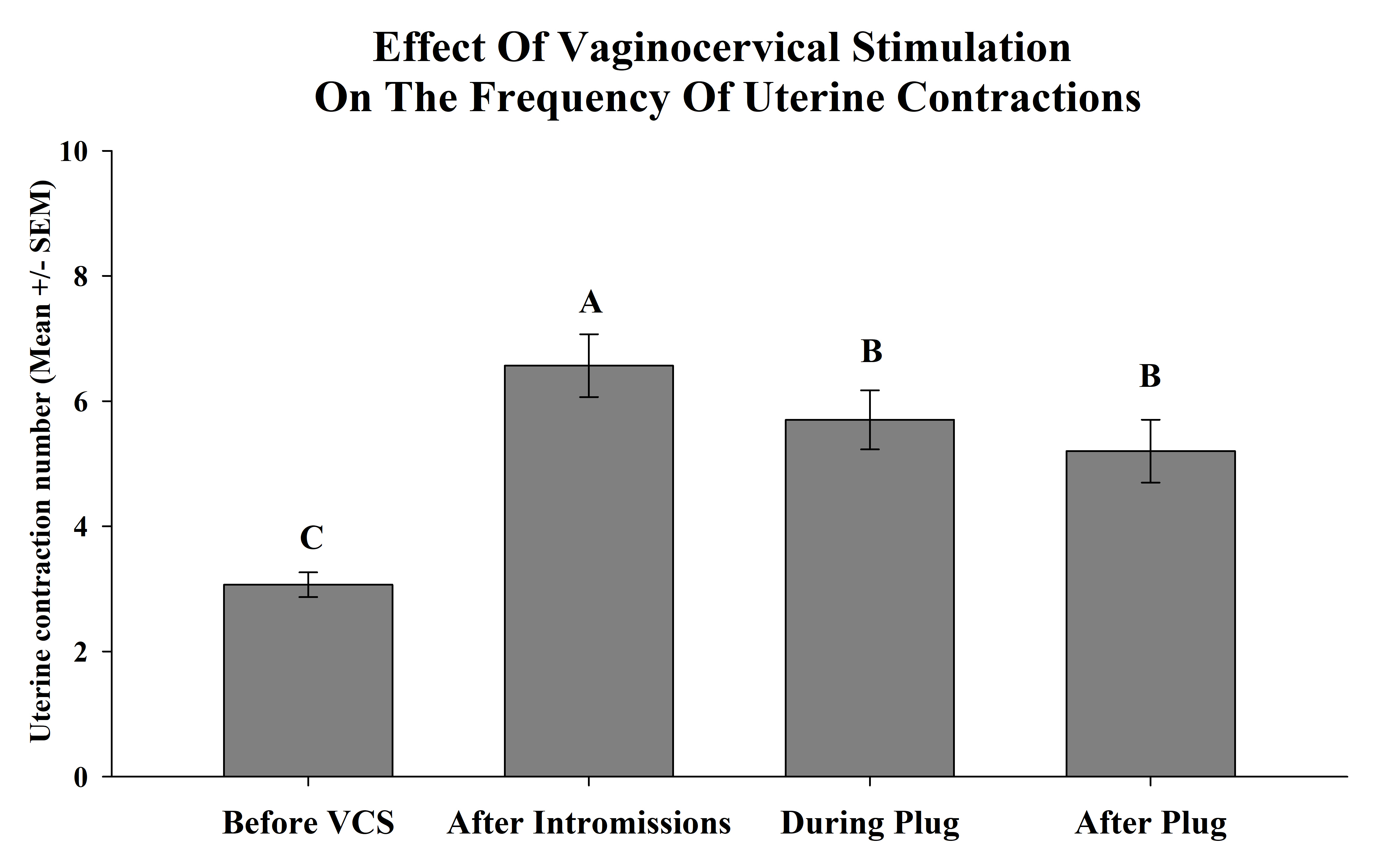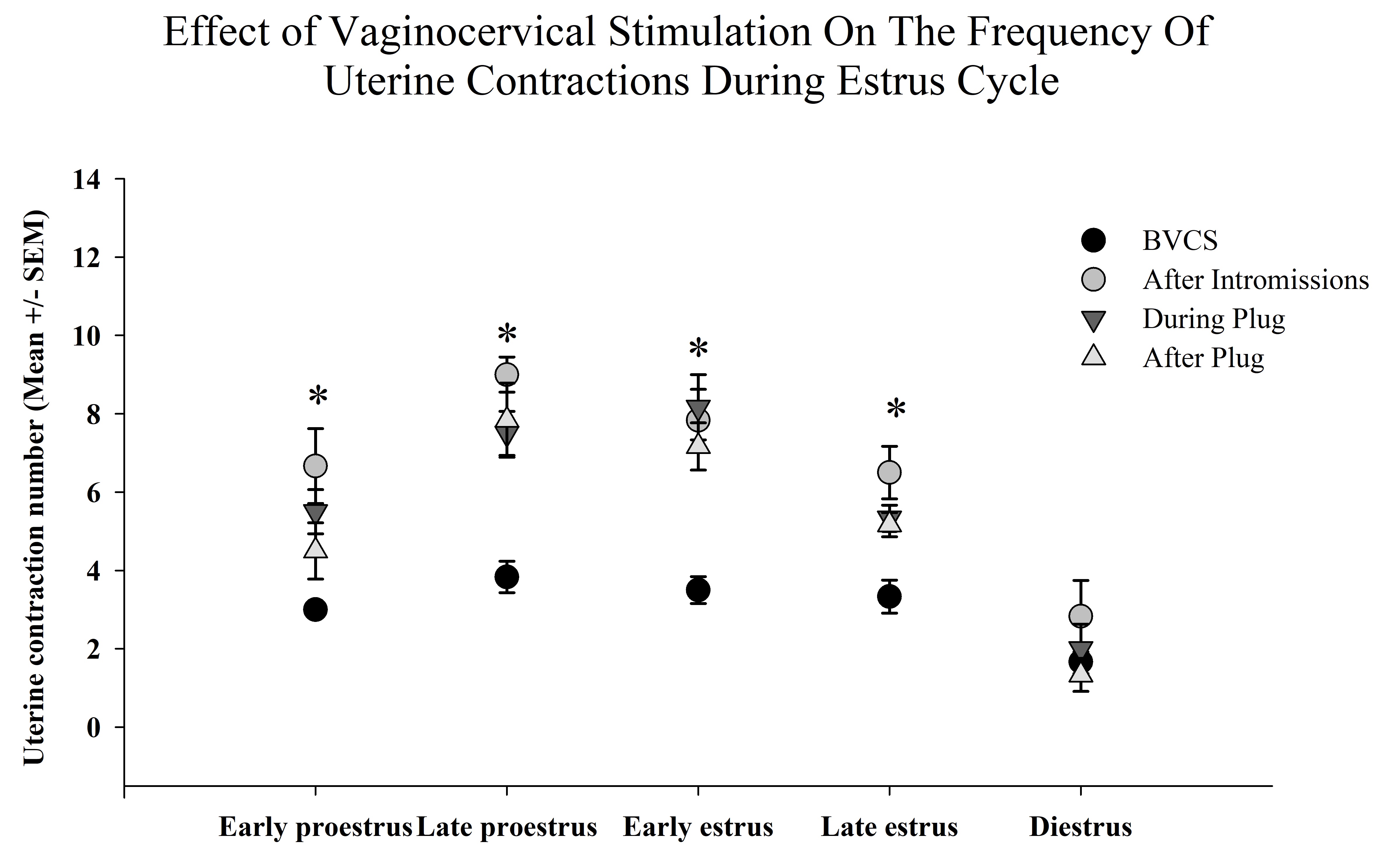 The present study was designed to improve our understanding about the interactions between sexual stimulation and the EC on the uterine activity of female rats. Accordingly, our results demonstrated that VCS increased the frequency of UC during most phases of the EC, except at diestrus. Since the diestrus is characterized by a low hormonal activity, it clearly suggests that the effect of the VCS on the uterine activity depends on the levels and activity of hormones associated to EC in the female rat. On the other hand, the highest increment in the amount of UC as consequence of intromissions was observed during late-proestrus. Copulatory behavior is observed only during late-proestrus in rats. Consequently, we consider that the particular increment in the uterine activity during this period is oriented to facilitate reproductive processes such as sperm transport and fertilization. The role of hormones and sexual stimulation on the uterine activity, as well as the potential implication in reproductive processes is discussed as follows.
